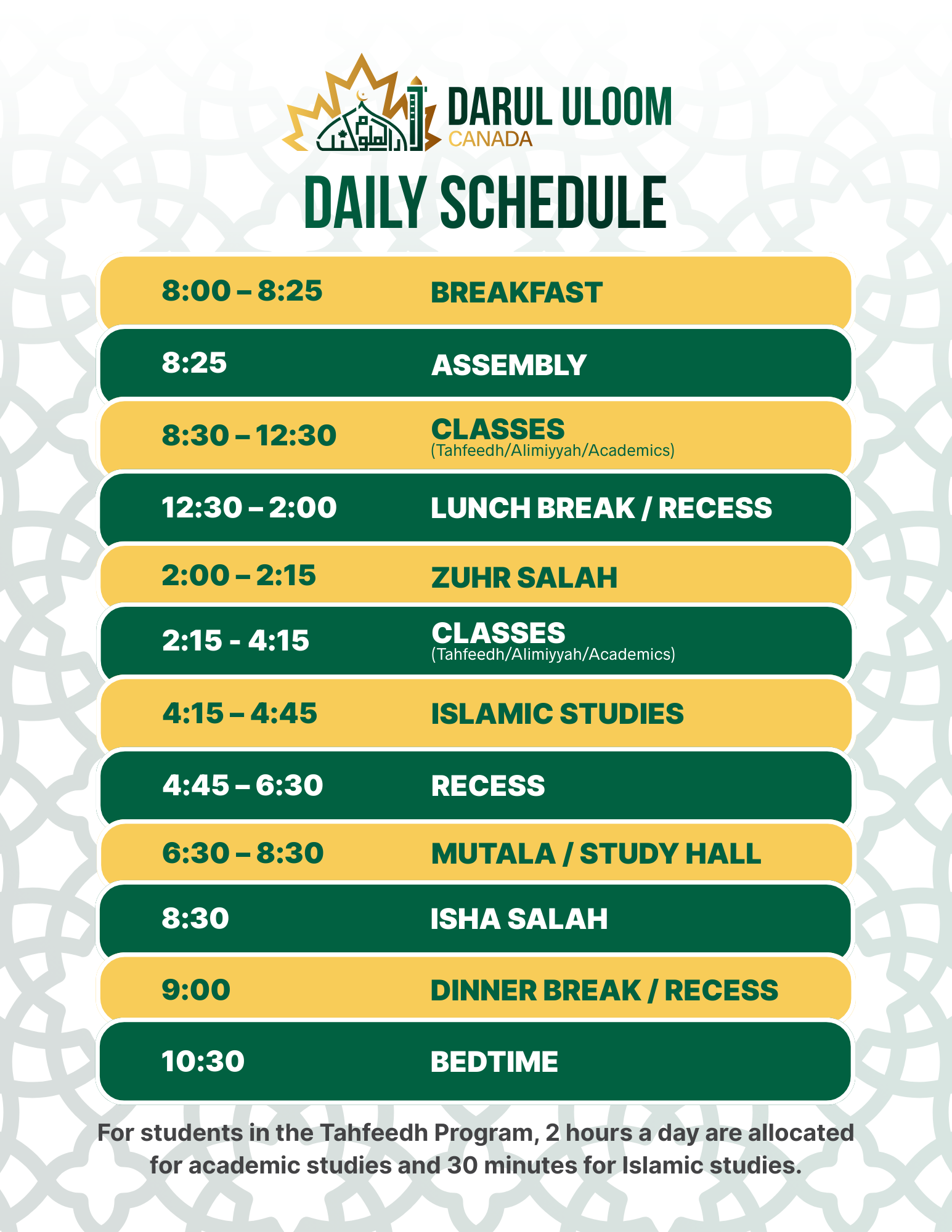 Students follow a structured daily routine that blends academic studies, Qur’an memorization, Islamic sciences, and recreation all centered around the five daily prayers.